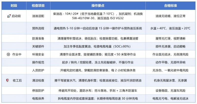做好設(shè)備 “防凍預(yù)熱” 是關(guān)鍵低溫易導(dǎo)致油液凝滯、電瓶虧電,需優(yōu)先完成三項(xiàng)準(zhǔn)備:一是更換適配油液,柴油需選用比當(dāng)?shù)氐蜏氐?7-10℃的抗凝型號(如 - 10#/-20#),同時添加抗凝劑;液壓油、機(jī)油換為冬季低黏度專用款,冷卻液更換為 - 30℃以下防凍型。二是規(guī)范預(yù)熱流程,先通電預(yù)熱 5-10 分鐘,啟動后怠速運(yùn)轉(zhuǎn) 15 分鐘,待水溫超 40℃、液壓油溫超 20℃再操作,露天設(shè)備可加裝燃油預(yù)熱器提升啟動效率。三是細(xì)節(jié)檢查,清理履帶 / 輪胎積雪結(jié)冰,調(diào)低胎壓增加接地面積,包裹裸露油管,確保暖風(fēng)、除霜功能正常。