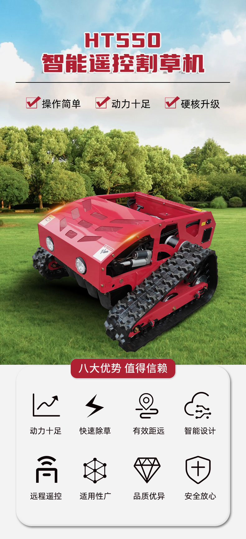 HT550A遙控割草機(jī)?采用意大利旋切技術(shù)工藝和歐美作業(yè)環(huán)境結(jié)合的設(shè)計(jì)原理,智能除草,簡(jiǎn)單方便。