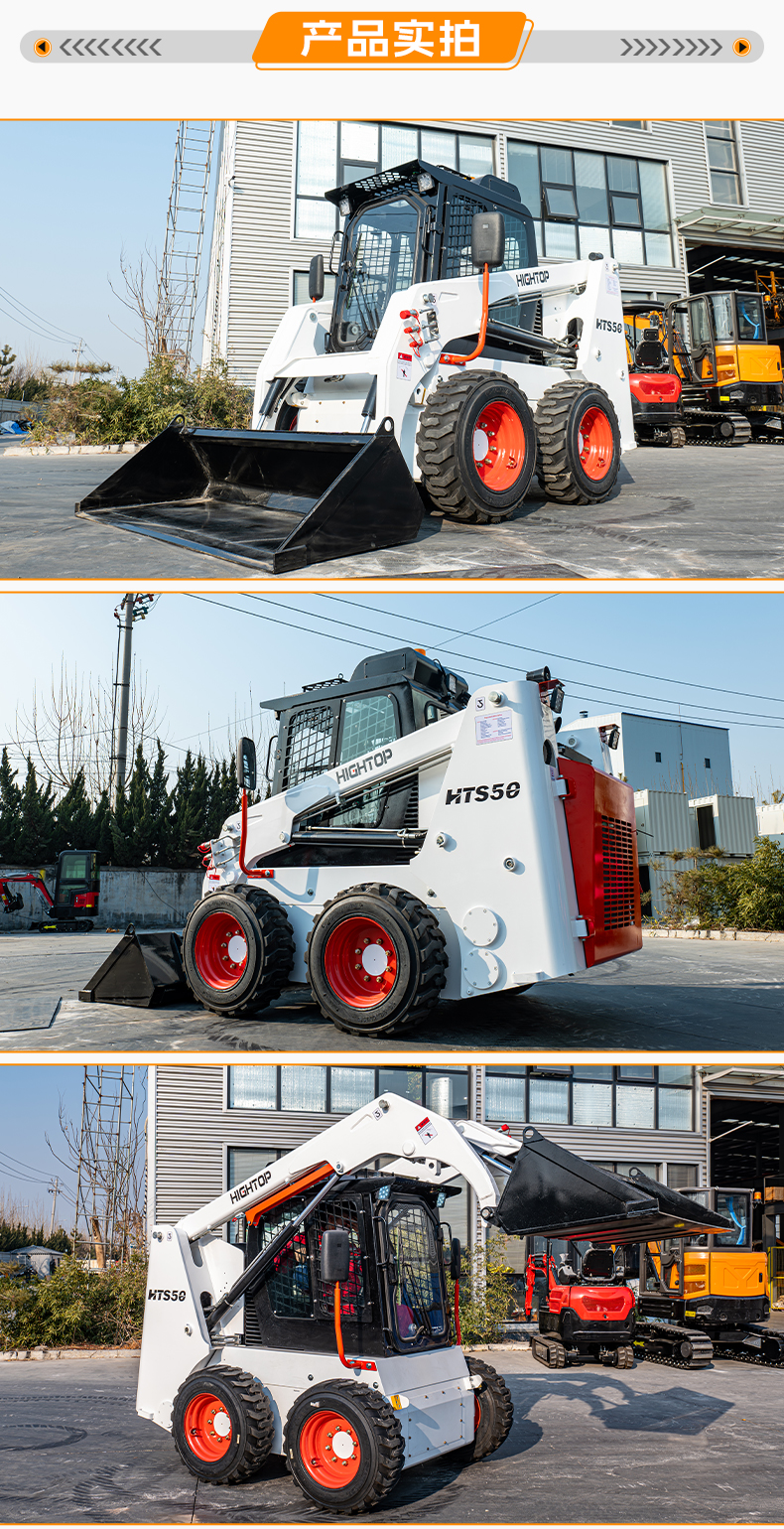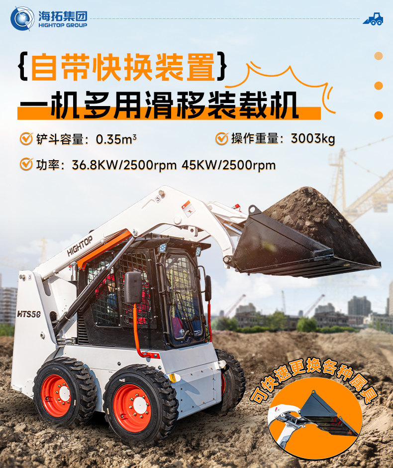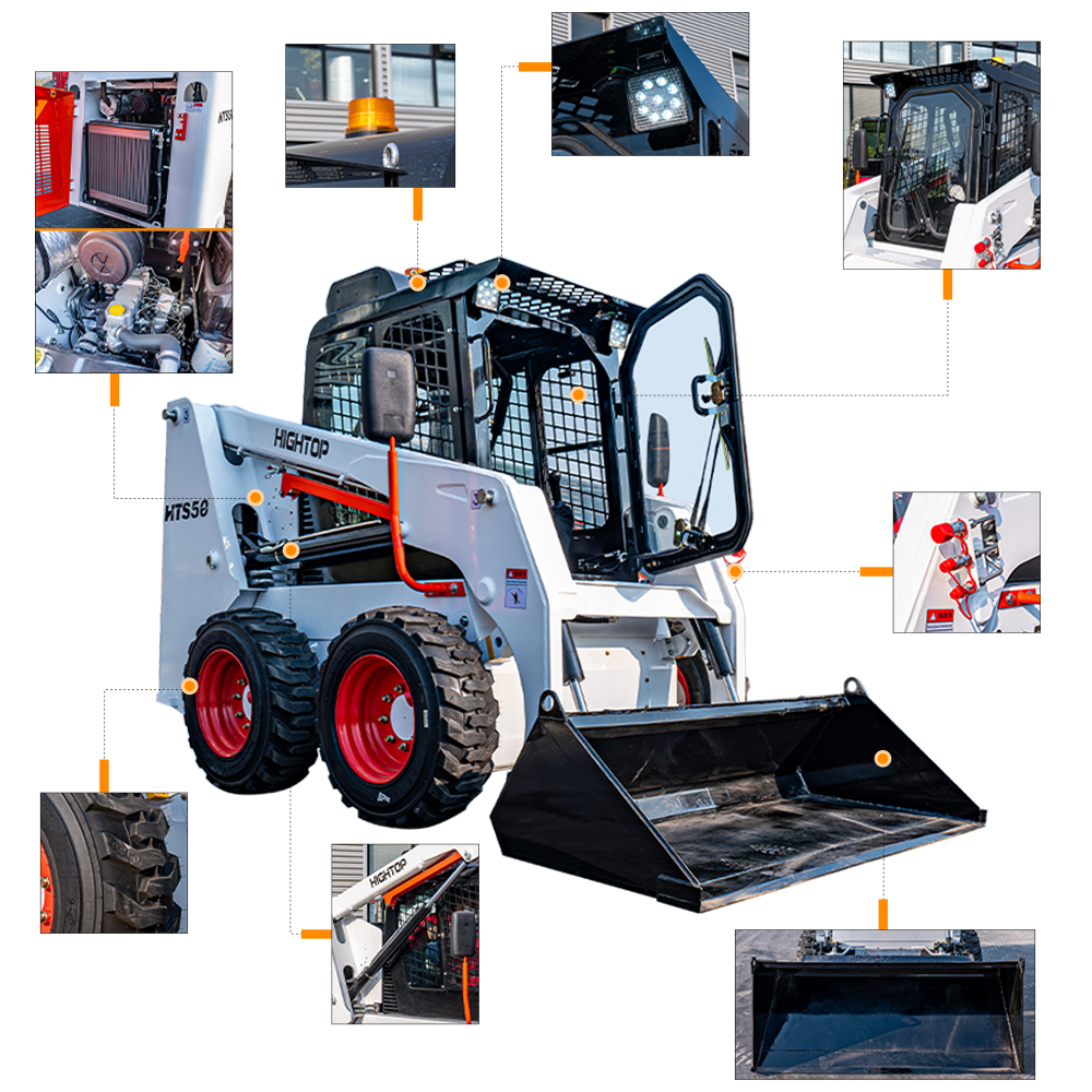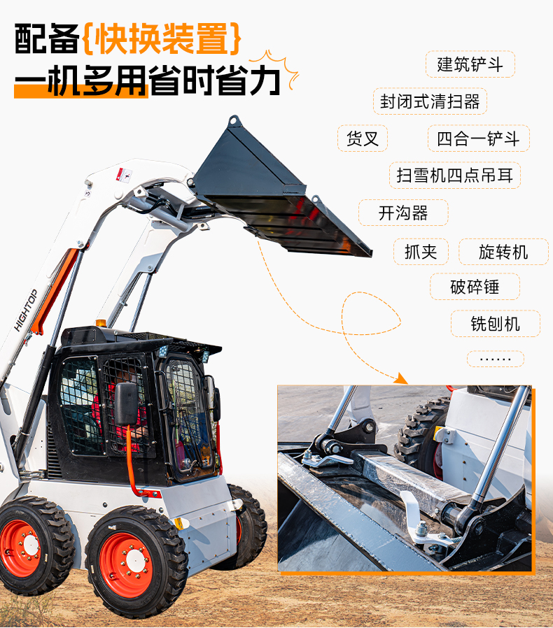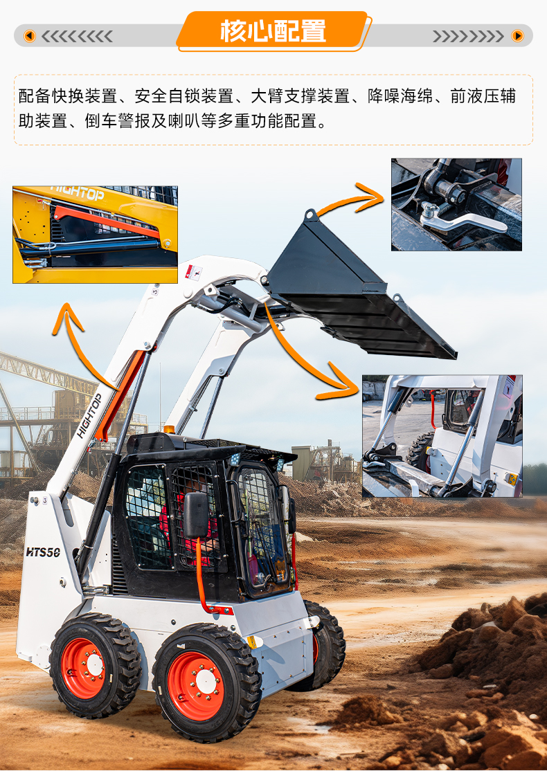 HTS50滑移裝載機配備快換裝置、安全自鎖裝置、大臂支撐裝置、降噪海綿、前液壓輔助裝置、倒車警報及喇叭等多重功能配置。