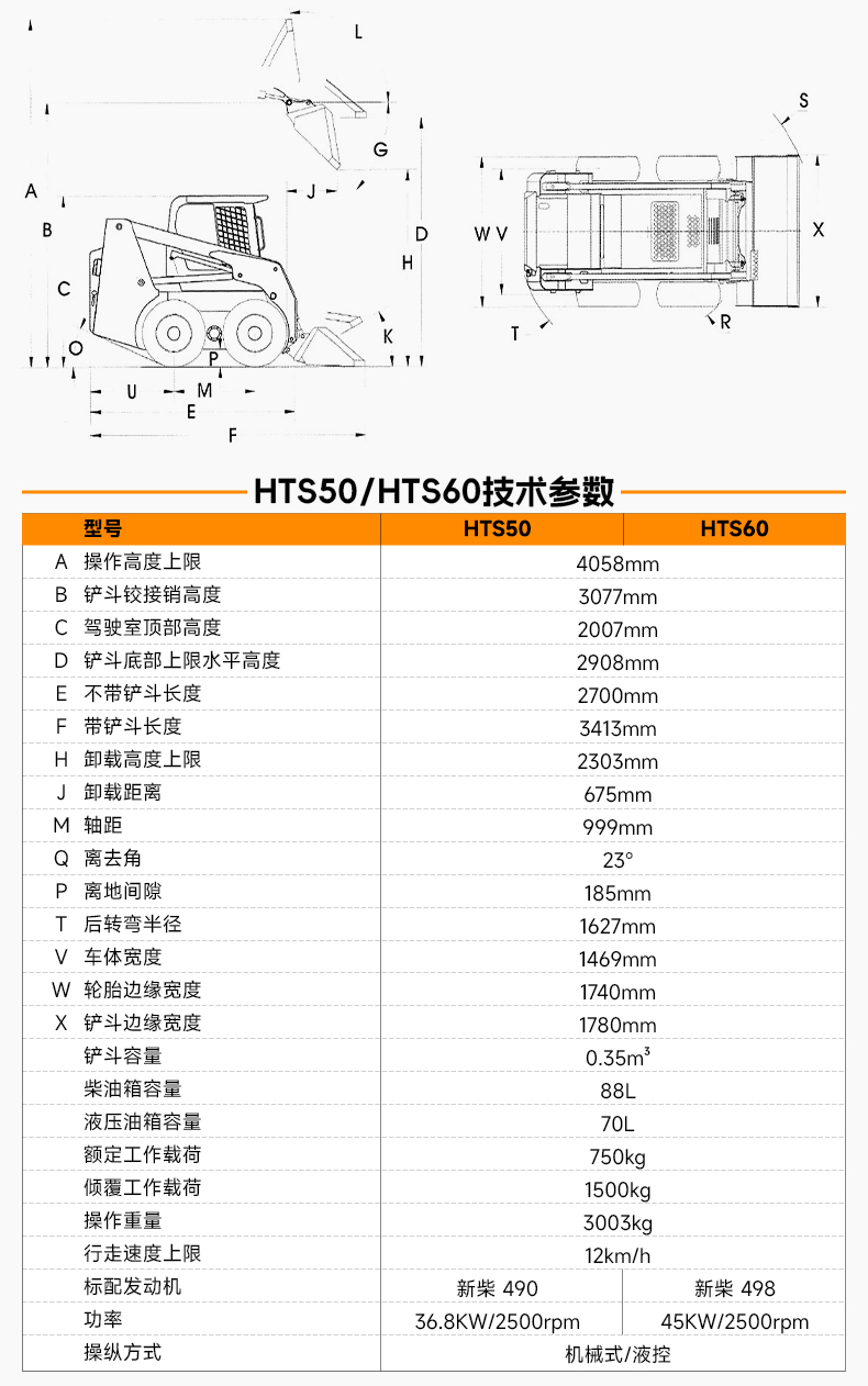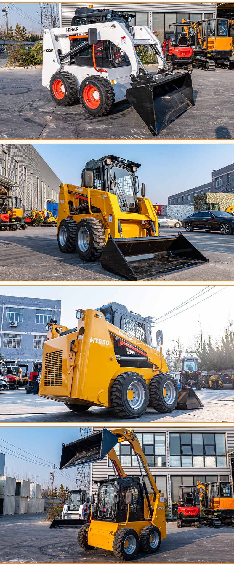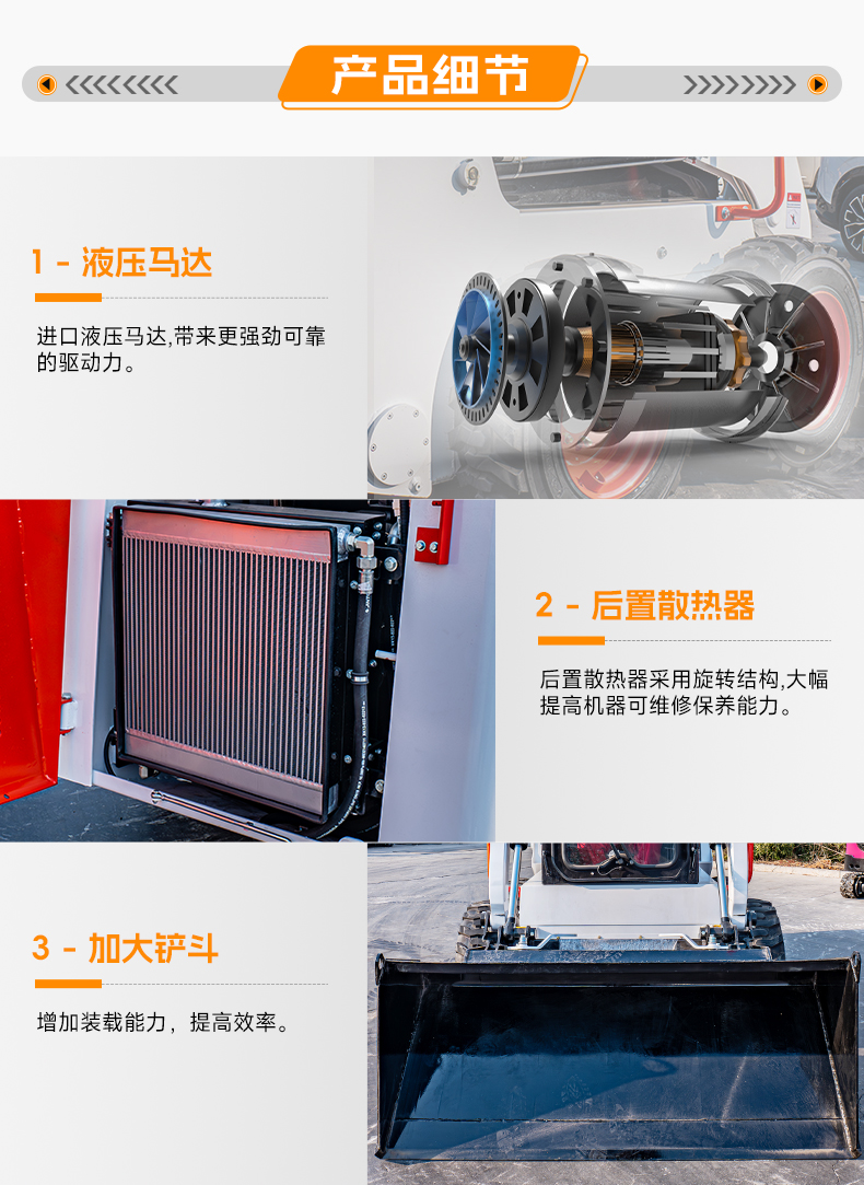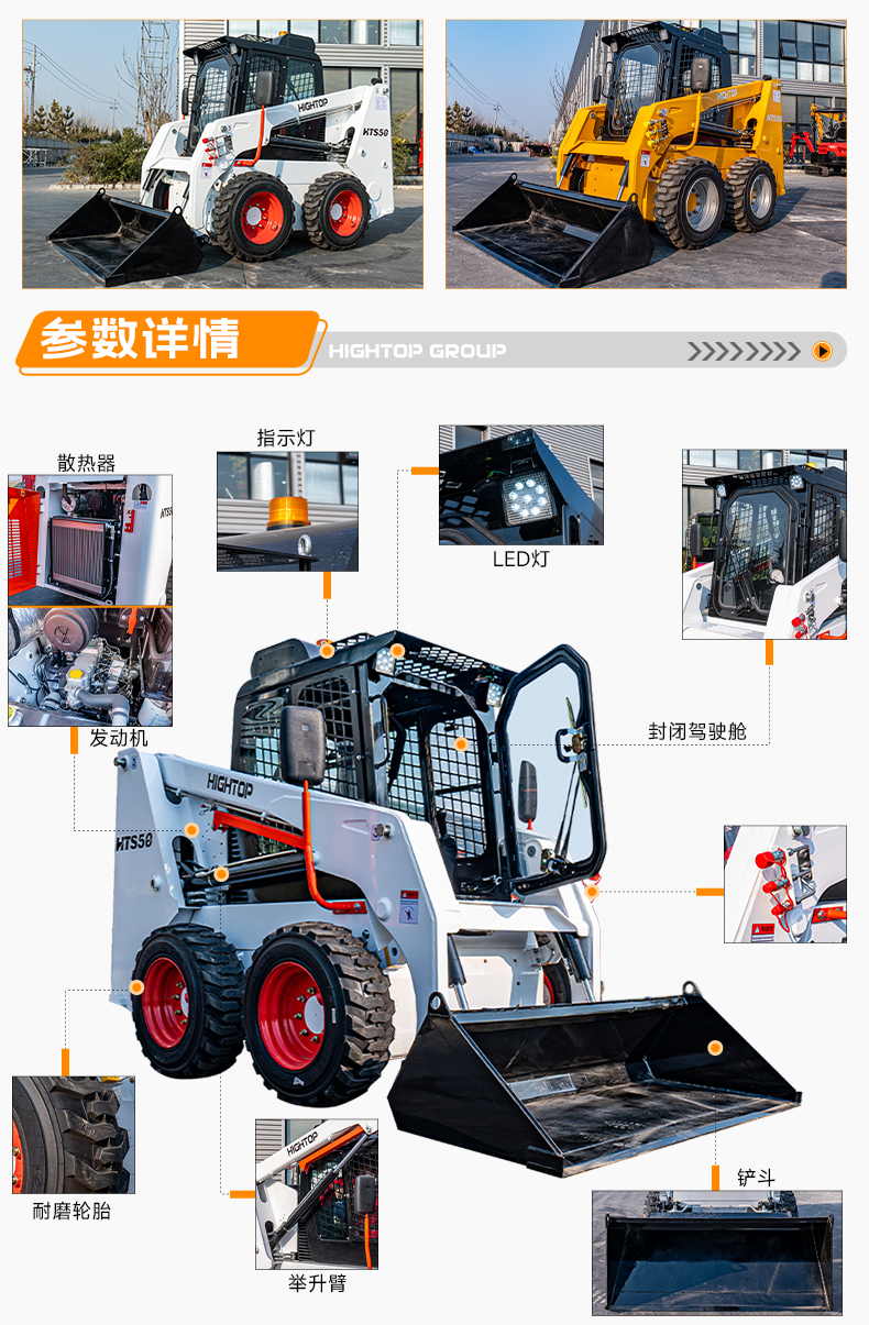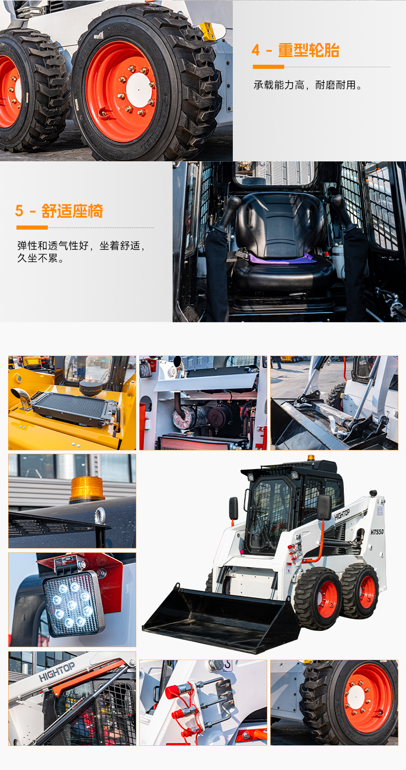 HTS50滑移裝載機配備快換裝置、安全自鎖裝置、大臂支撐裝置、降噪海綿、前液壓輔助裝置、倒車警報及喇叭等多重功能配置。