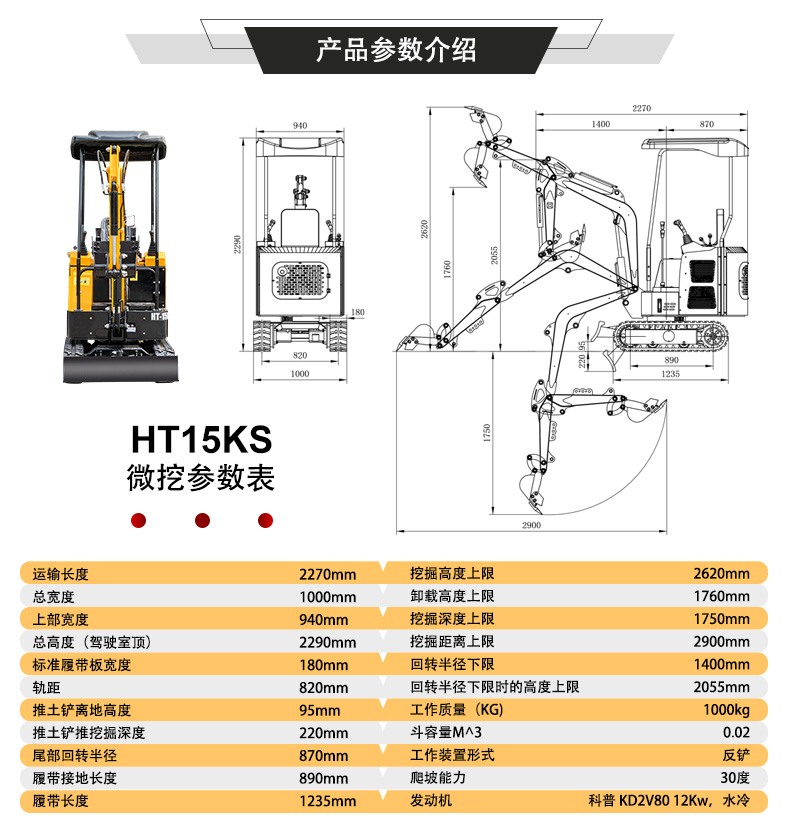 在整機(jī)尺寸方面,它運(yùn)輸長(zhǎng)度僅 2270mm,總寬度 1000mm,上部寬度 940mm,總高度(駕駛室頂)2290mm,這樣緊湊的身形使其能輕松穿梭于狹窄場(chǎng)地。標(biāo)準(zhǔn)履帶板寬度 180mm,軌距 820mm,履帶接地長(zhǎng)度 890mm,履帶長(zhǎng)度 1235mm,配合 30 度的爬坡能力,確保在多種地形都能穩(wěn)定行駛。推土鏟離地高度 95mm,推挖掘深度 220mm,尾部回轉(zhuǎn)半徑 870mm,進(jìn)一步提升了其在受限空間內(nèi)的操作靈活性。