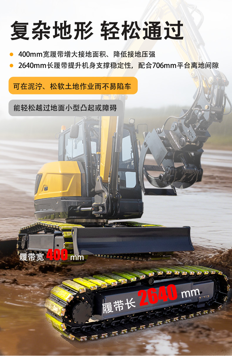 2. 復雜地形通過性強:400mm寬履帶增大接地面積、降低接地壓強,可在泥濘、松軟土地作業(yè)而不易陷車;2640mm長履帶提升機身支撐穩(wěn)定性,配合706mm平臺離地間隙,能輕松越過地面小型凸起或障礙。