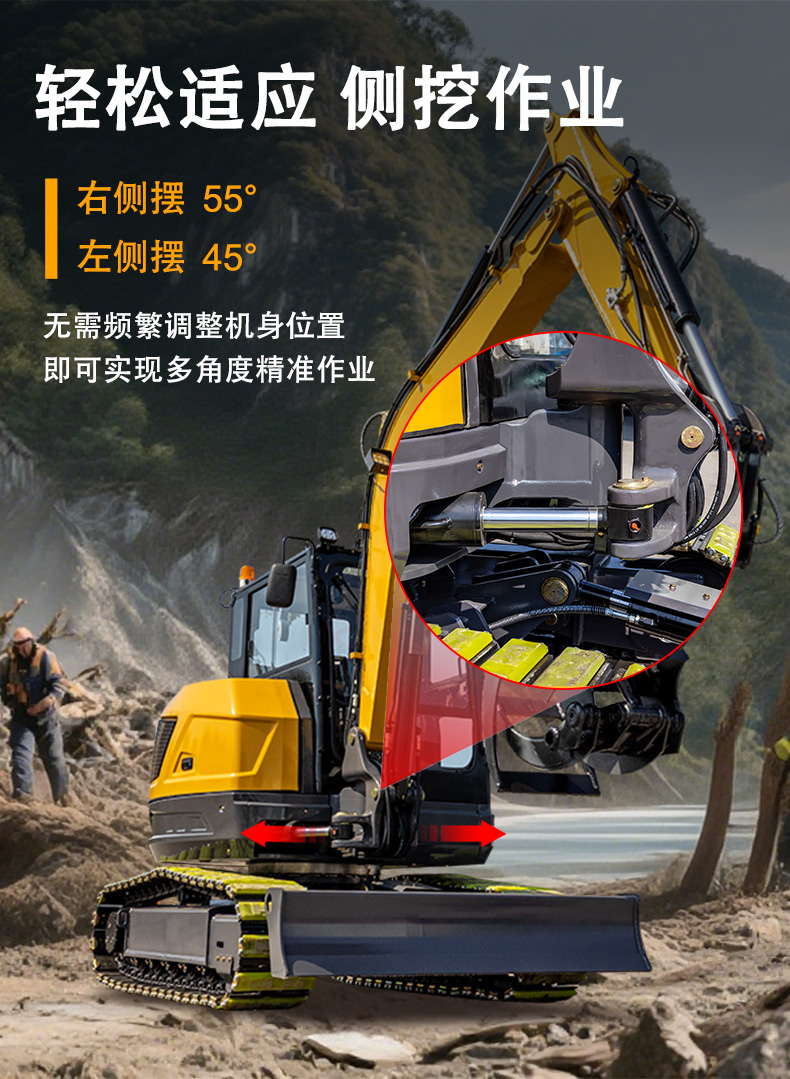 7. 側挖作業(yè)適應性突出:支持左45°、右55°側擺角度,在邊坡修整、溝渠側壁開挖等場景中,無需頻繁調整機身位置,即可實現(xiàn)多角度精準作業(yè),尤其適合市政管線鋪設時的側邊施工需求。
